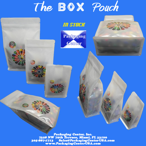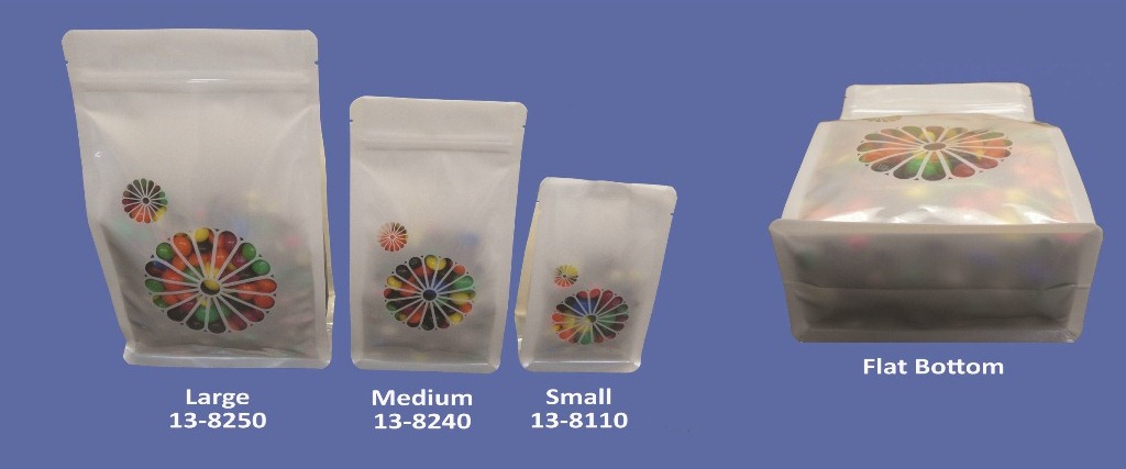 A new design of pouch that has a completely flat bottom, much like a box. The Flat Bottom allows for all kinds of products to stand upright very sturdily.